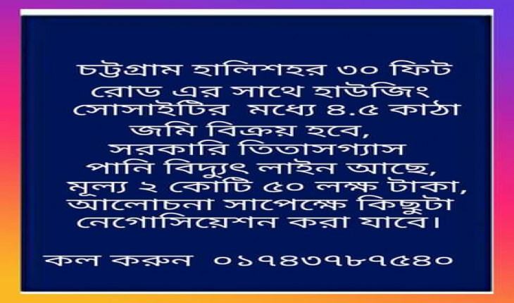 চট্টগ্রাম হালিশহরে হাউজিং সোসাইটির মধ্যে ৪.৫ কাঠা জমি বিক্রয় হবে। উক্ত জমিতে সরকারি তিতাসগ্যাস, পানি, বিদ্যুৎ লাইন আছে। ছোট ছোট ৩ রুমের বাড়ি আছে। আশেপাশে ৯/১০ তলা বিল্ডিংয়ের কাজ চলছে। মূল্য ২ কোটি ৫০ লক্ষ টাকা। যোগাযোগ নাম্বার ০১৭৪৩৭৮৭৫৪০