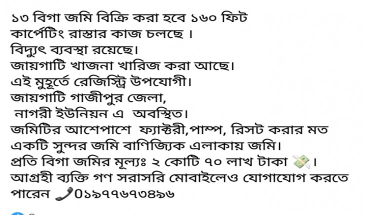 ১৩ বিগা জমি বিক্রি করা হবে ১৬০ ফিট কার্পেটিং রাস্তার কাজ চলছে । বিদ্যুৎ ব্যবস্থা রয়েছে। জায়গাটি খাজনা খারিজ করা আছে। এই মুহূর্তে রেজিস্ট্রি উপযোগী। জায়গাটি গাজীপুর জেলা, নাগরী ইউনিয়ন এ অবস্থিত। জমিটির আশেপাশে ফ্যাক্টরী,পাম্প, রিসট করার মত একটি সুন্দর জমি বাণিজ্যিক এলাকায় জমি। প্রতি বিগা জমির মূল্যঃ ২ কোটি ৭০ লাখ টাকা