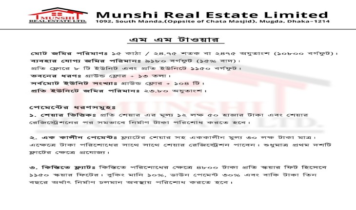 ১. শেয়ার ভিত্তিকঃ প্রতি শেয়ার এর মূল্য ১২ লক্ষ ৫০ হাজার টাকা এবং শেয়ার রেজিস্ট্রেশনের পর সমভাবে নির্মাণ টাকা পরিশোধ করতে হবে।